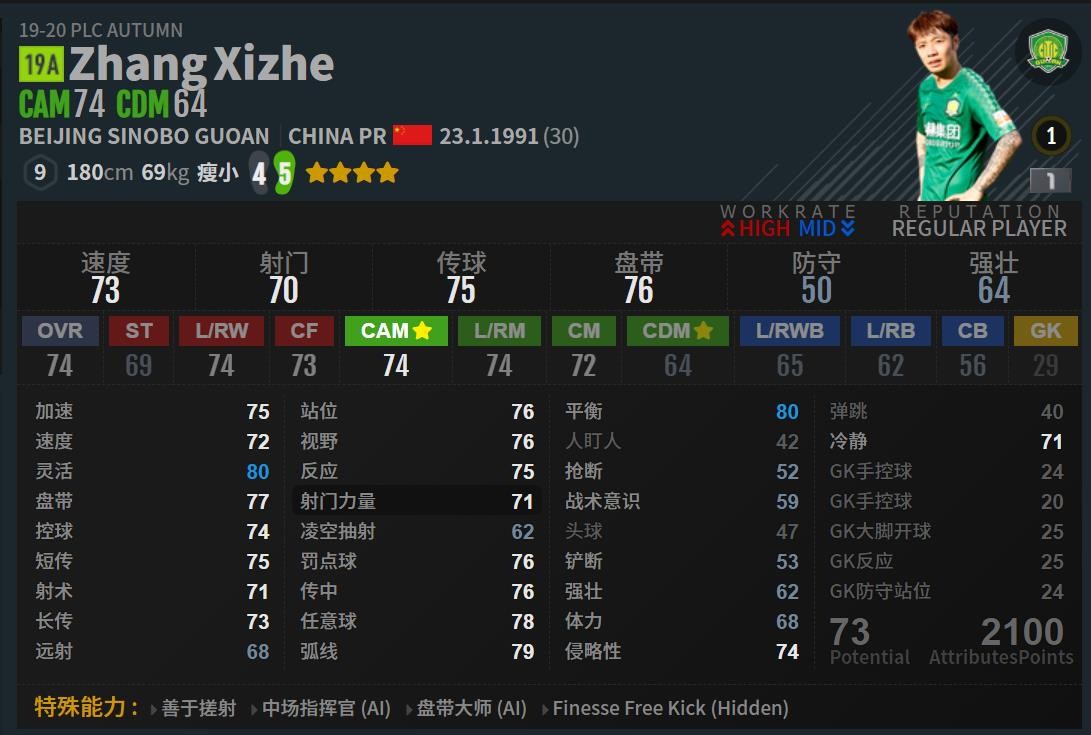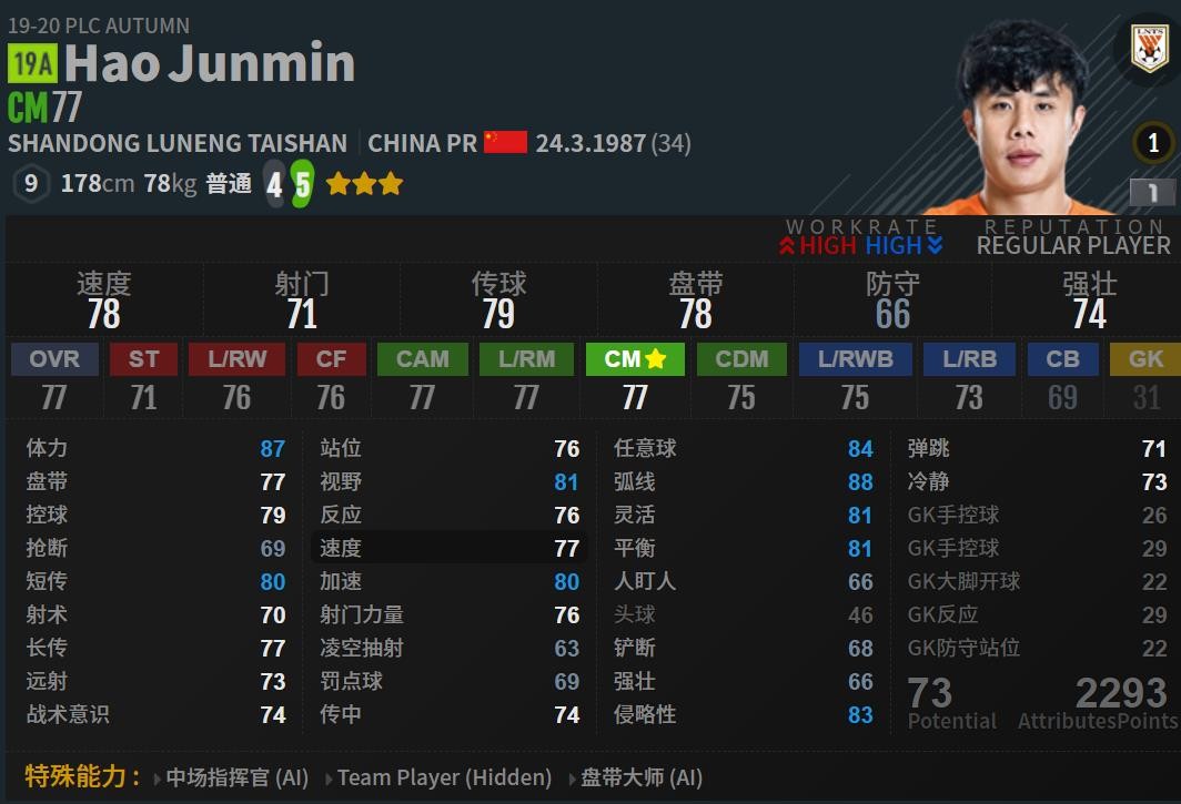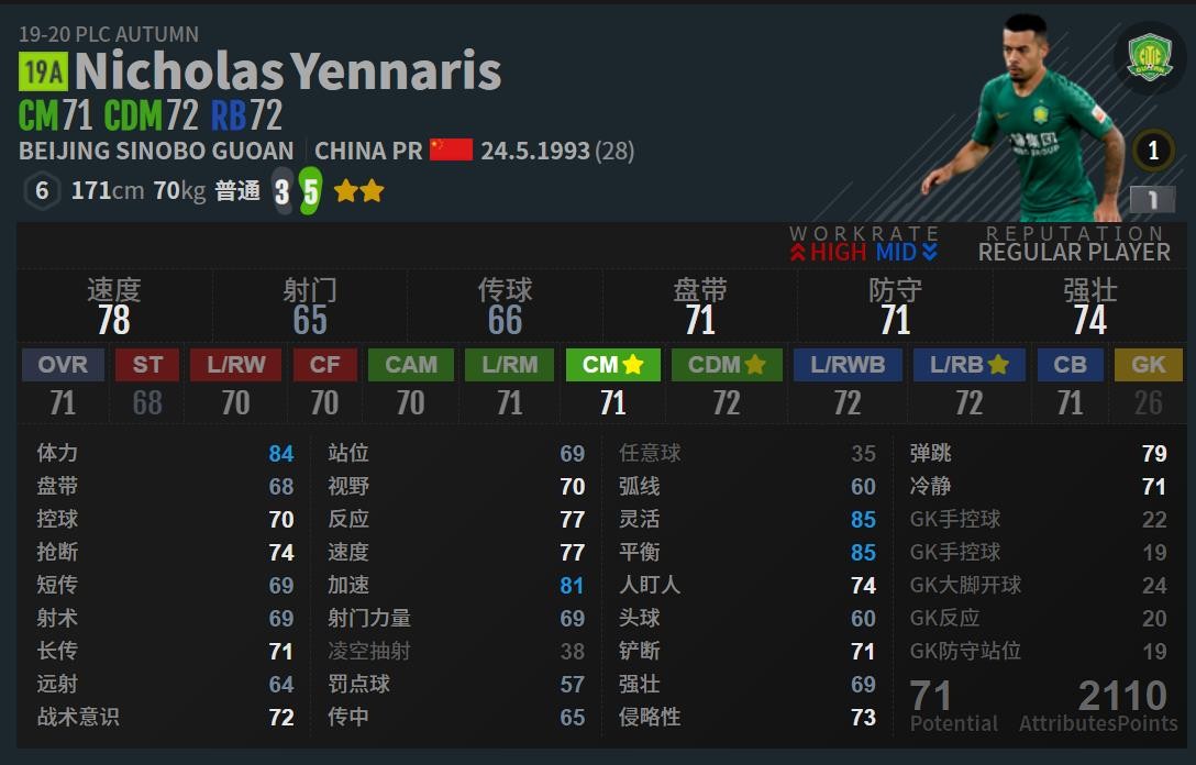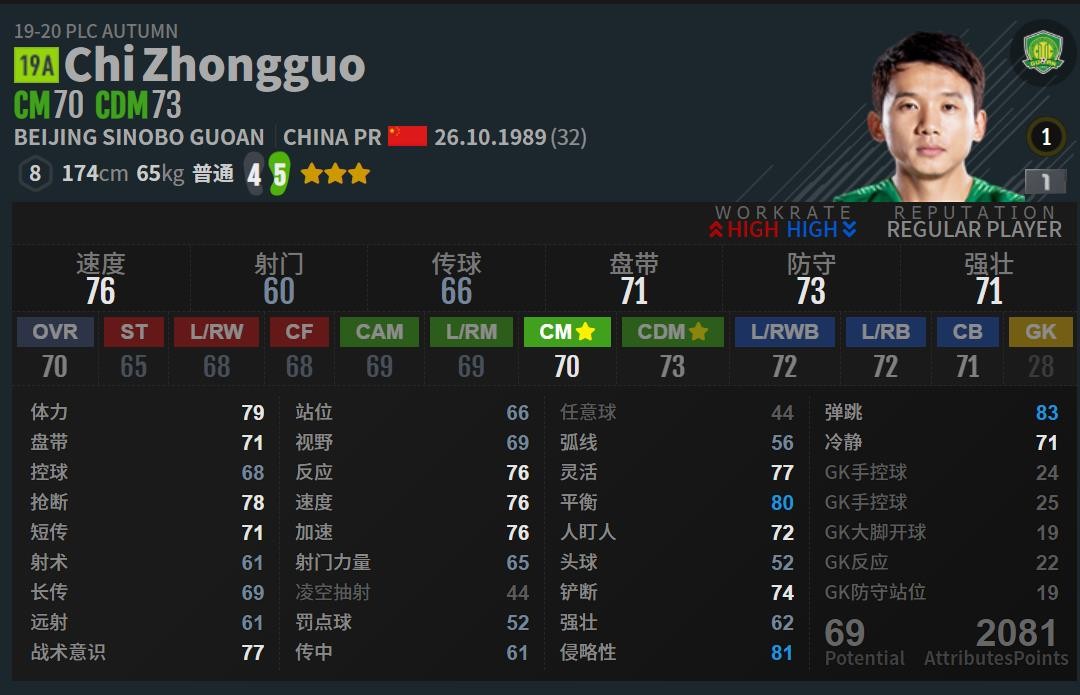 这个数据也只能说是非常普通 ,作为中场球员几项核心的盘带,控球,抢断等都属于普通水平,我们再对比一下国足其他几位中场球员的数据