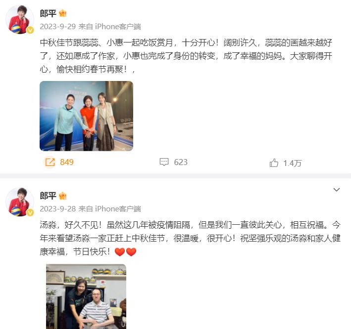 郎平上一次回国是在2023年9月,当时,她还特意去看望了男排名宿汤淼,后者已经瘫痪很多年,曾是国内知名男排运动员,但在训练中意外重伤,除了职业生涯终结之外,甚至连平时的生活都变得很困难。郎平非常暖心,她几乎每年都会去看望汤淼,鼓励汤淼和他的家人,这点也让人很感动。而且,郎平还和她的两位弟子惠若琪、赵蕊蕊在中秋节的时候一起吃饭赏月,还称赞赵蕊蕊的画越来越好,如愿成为作家,而惠若琪则成为幸福的妈妈。