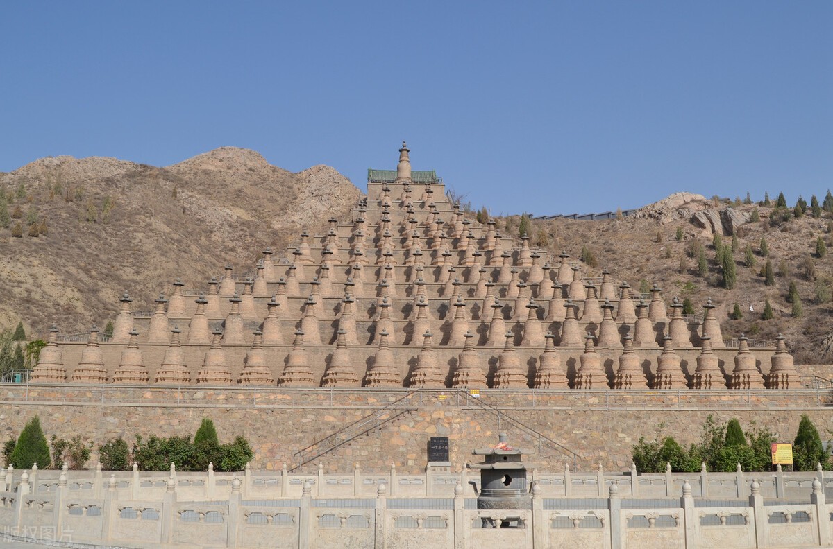 一百零八塔,位于宁夏吴忠青铜峡市,是一座现存最大、排列最奇特的西夏时期藏传佛教塔群。整个景区内以一百零八塔为主体,南边为塔林寺中为保护核心区一百零八塔,北边为塔林博物馆,总面积6980平方米。