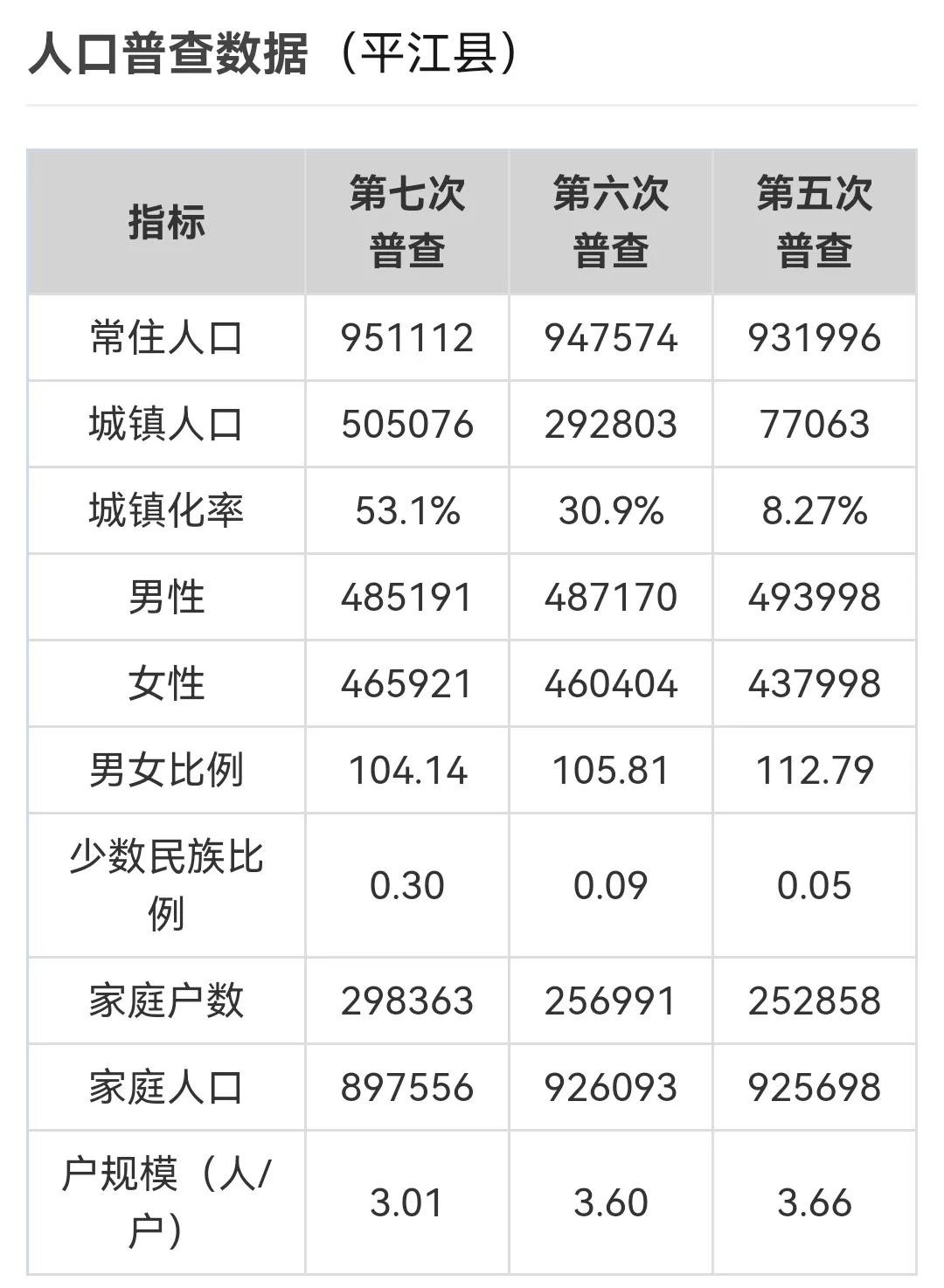 根据第七次人口普查数据,截至2020年11月1日零时,平江县常住人口为951112人。