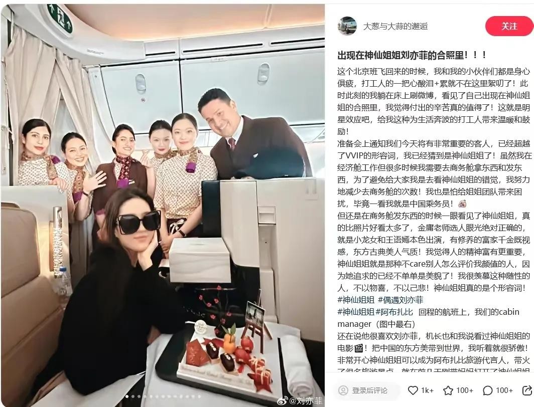这位空姐在配文中写道:“在飞行的旅途中,有幸与刘亦菲女士相遇,她的美丽与亲和力让我难以忘怀。”照片中,空姐与刘亦菲并肩而坐,笑容满面,看起来十分亲密。刘亦菲则以一头长发披肩,身穿简约而时尚的衣服,展现出了她的独特魅力。