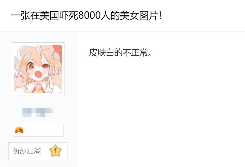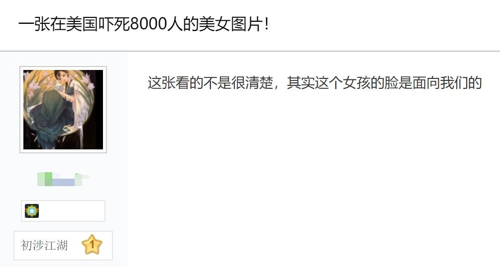 开个玩笑啊,这张照片最大的恐怖之处,就是没人知道她到底哪里恐怖,因为这本身就是一张再普通不过的中国女孩的照片,大约在2013年左右,该照片就被冠以“吓死8000美国人”的名头,在中国各大贴吧论坛上开始广泛传播。