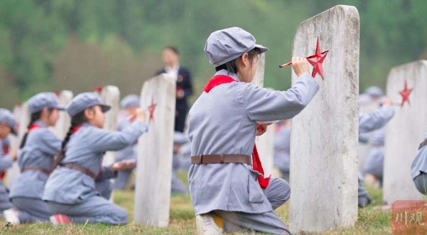 沙溪镇中心小学学生为无名烈士纪念园墓碑上的五角星描红