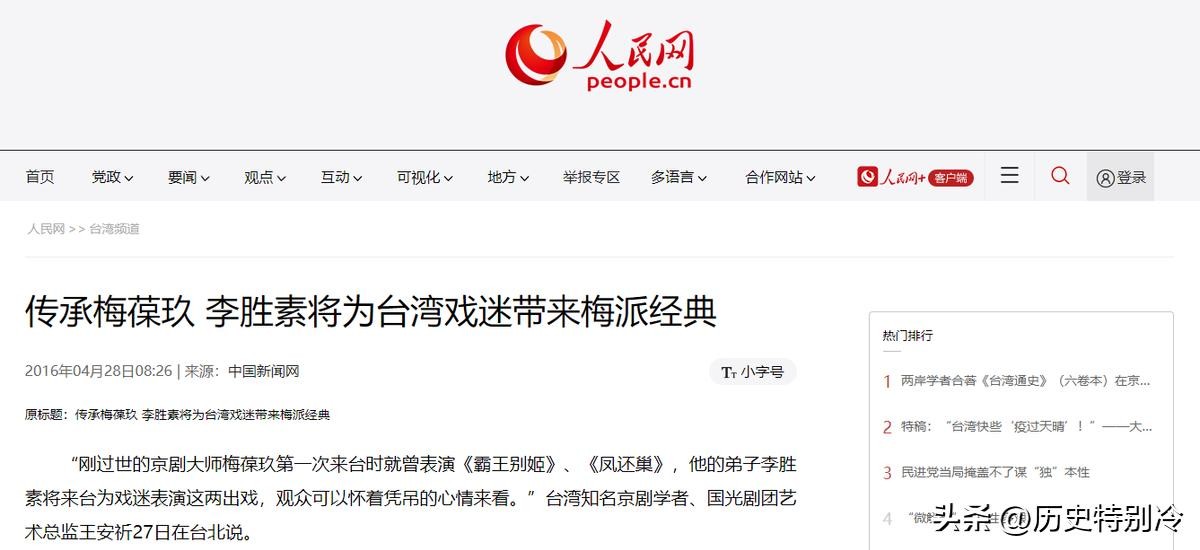 人民网:2016年4月28日,《传承梅葆玖 李胜素将为台湾戏迷带来梅派经典》