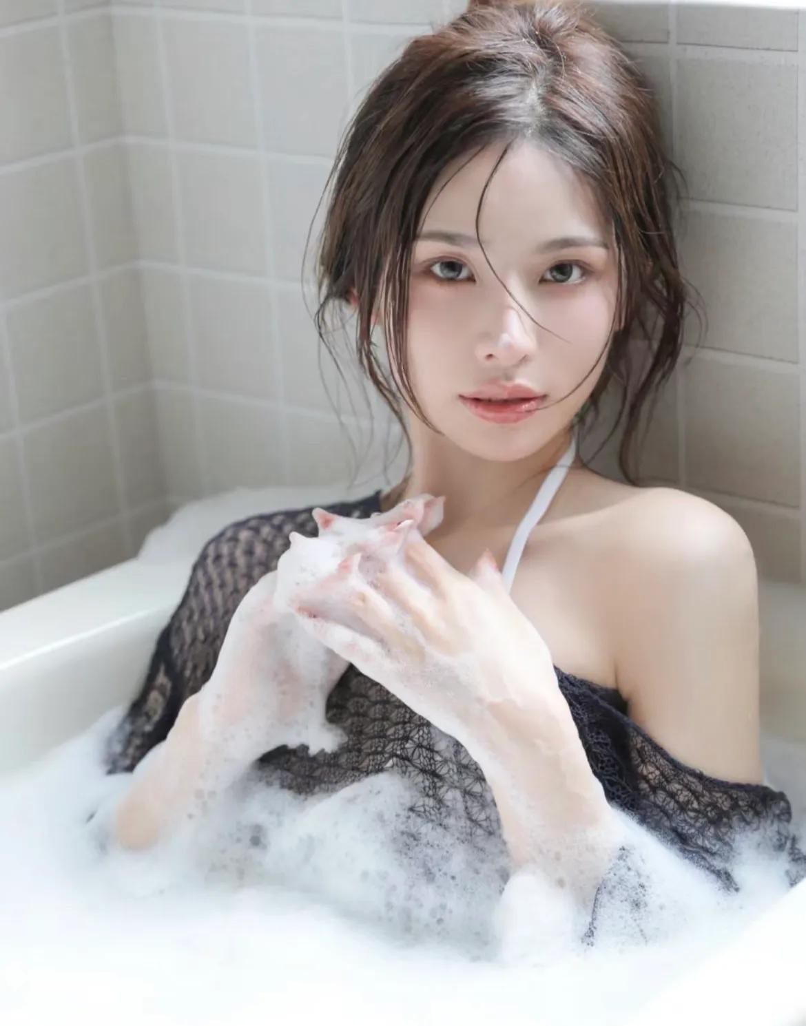 小丽利用家中的一些小道具来丰富照片的元素。她拿着一杯香槟,靠在浴缸旁,营造出轻松愉快的氛围。她还把手放在镜子上,遮住了一部分面容,增加了写真的神秘感。