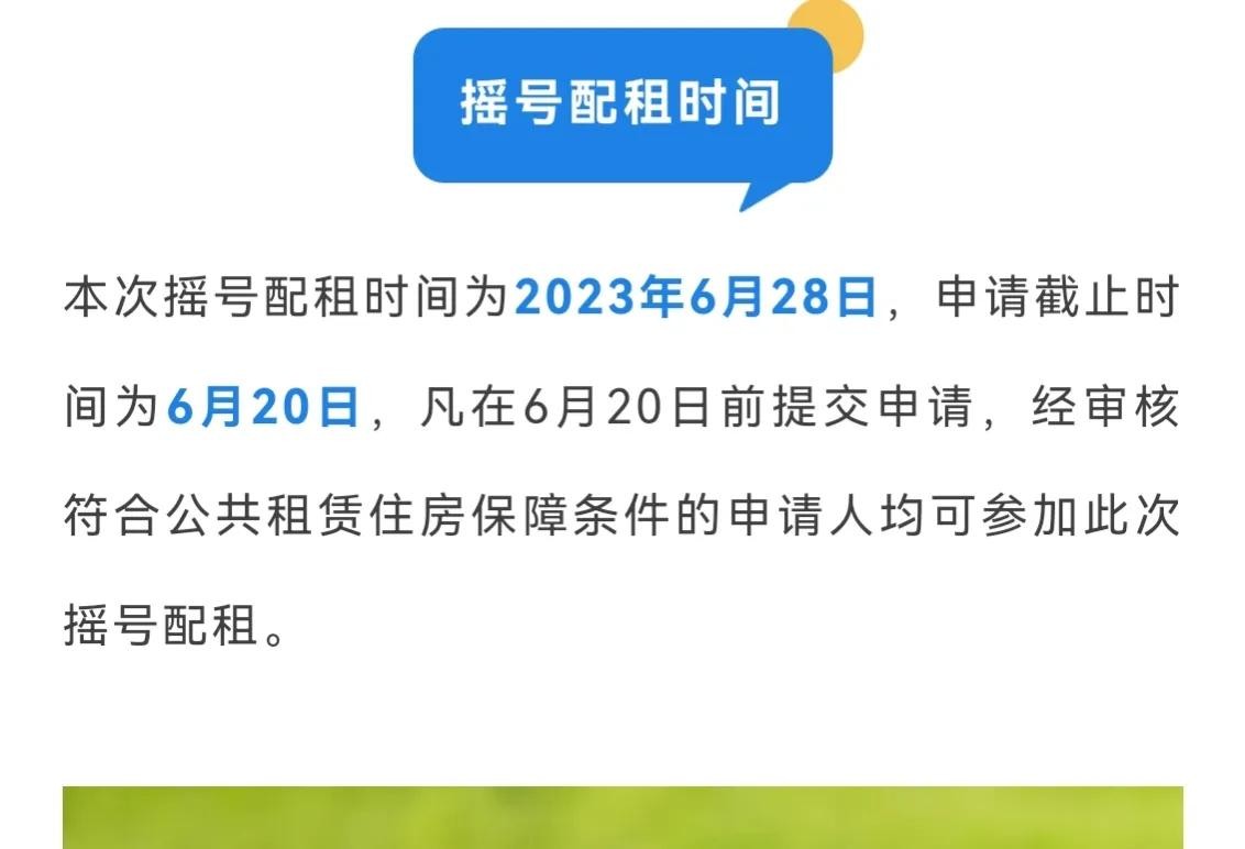 本次摇号配租时间为2023年6月28日!申请截止时间为6月20日,也就是今天就截止!只要在今天之前提交的申请,审核通过的,都可以参与本次摇号配租!