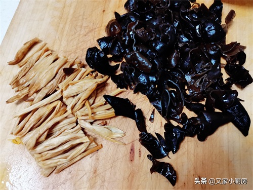 第一步,准备适量的羊腿肉切小块,葱姜蒜切碎,干辣椒切段,木耳和干黄花菜提前温水泡发洗净,再切好备用(有土豆粉条也可以提前泡软)。