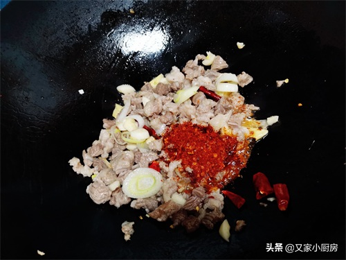 第三步,待肉里的水气完全没有后,放入葱、姜、蒜和干辣椒段炒出香味,再放入辣椒粉炒出辣椒红油。注意:我选用的辣椒粉辣味不太重,辣椒能起到去腥增香的作用。