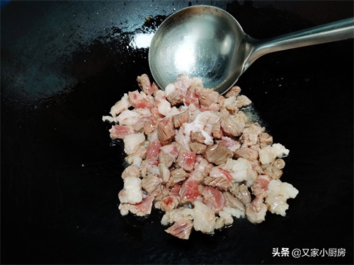 第二步,如果羊肉偏瘦,锅里加适量食用油(植物油或者羊油都可),放切好的羊肉块小火煸炒。