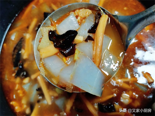 第七步,等待下入的配菜,煮熟,我们就可以把切好的粉块下入锅里,粉块大小2厘米左右就可以,我用绿豆淀粉自制的凉粉,做法我在以前文章也分享过。凉粉下入锅里受热就会变透明,不建议煮的时间太久,水开就可以最后调味了。