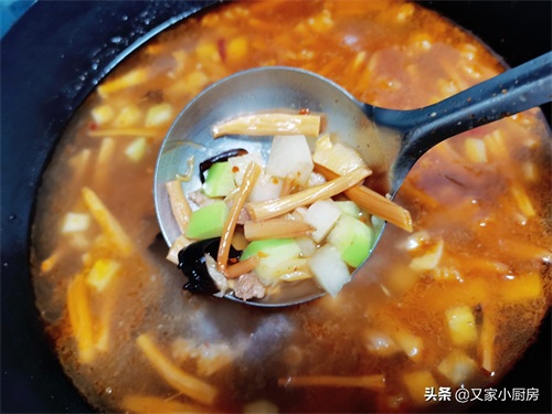 第六步,汤煮沸,下入木耳、黄花菜和萝卜块(喜欢吃土豆粉条的也可以一并下入)。