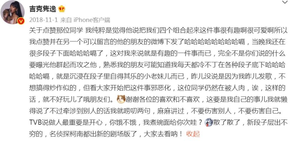在整件事情里面,吉克隽逸只表态过一次,却莫名其妙收到了部分人的同情。