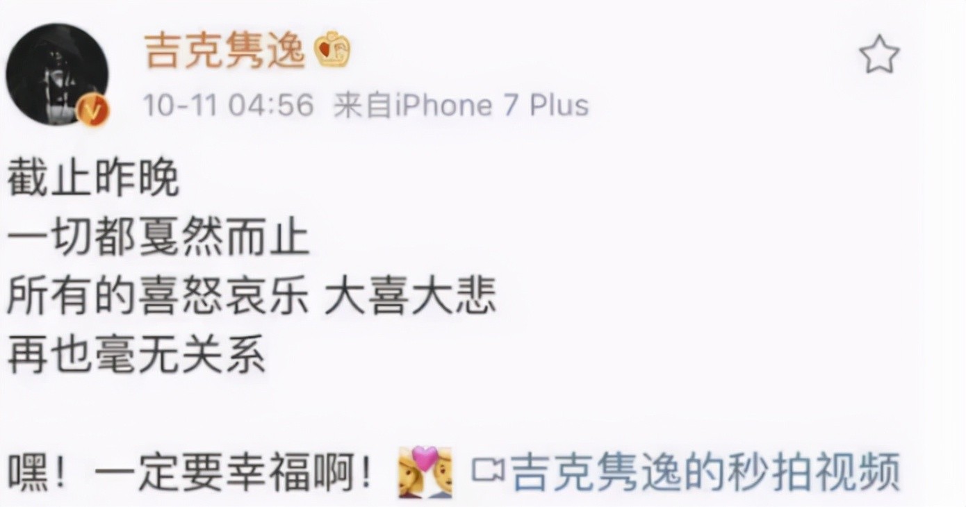 吉克隽逸表示无所谓,发了条微博表示“结束了”。