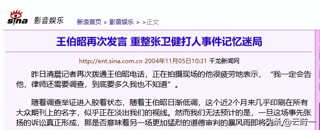 2004年,张卫健、谢霆锋打人事件闹得沸沸扬扬,受害者的王伯昭被打的满脸是血、大腿肿胀,要求二人赔偿100万。