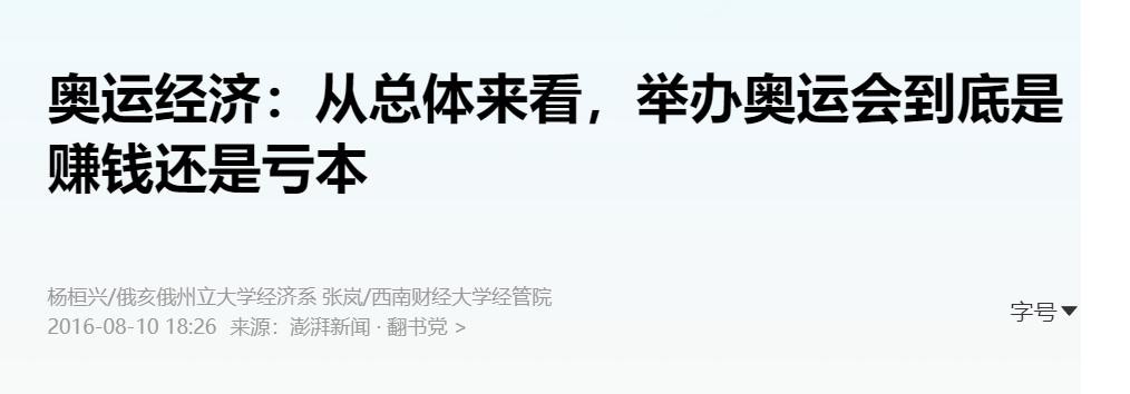 澎湃新闻在 2016-08-10关于《奥运经济:从总体来看,举办奥运会到底是赚钱还是亏本》的报道