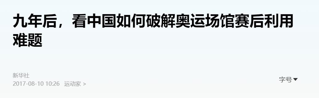 新华社在 2017-08-10关于《九年后,看中国如何破解奥运场馆赛后利用难题》的报道