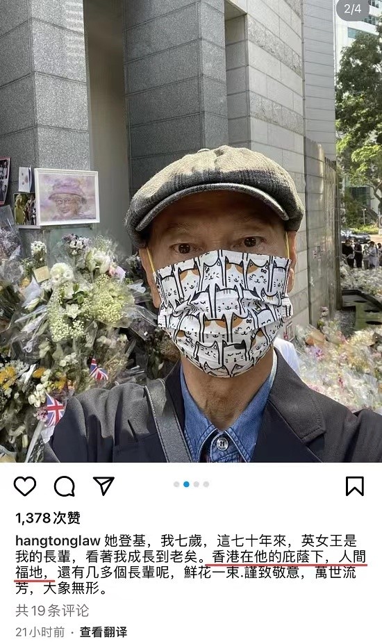 9月13日,罗家英前往英国驻香港领事馆献花悼念英国女王,并发文“香港在他的庇荫下,人间福地。”
