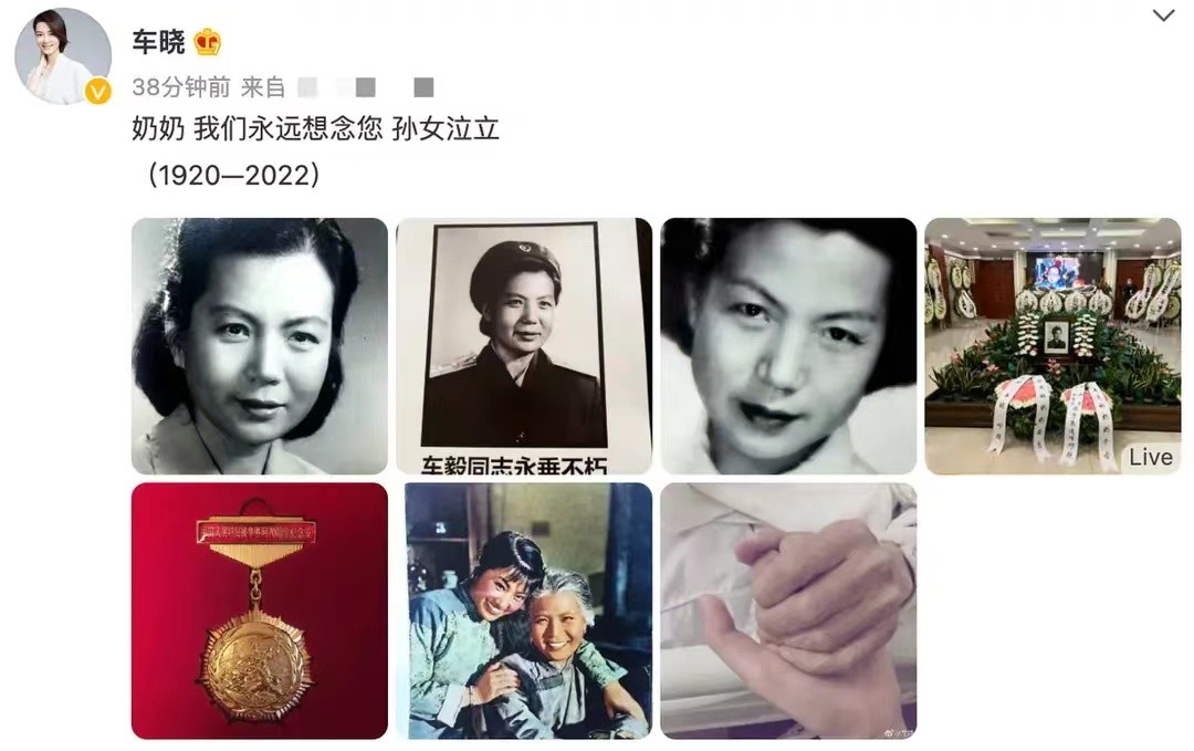 9月6日,演员车晓发文,证实奶奶车毅已经离世,享年102岁。