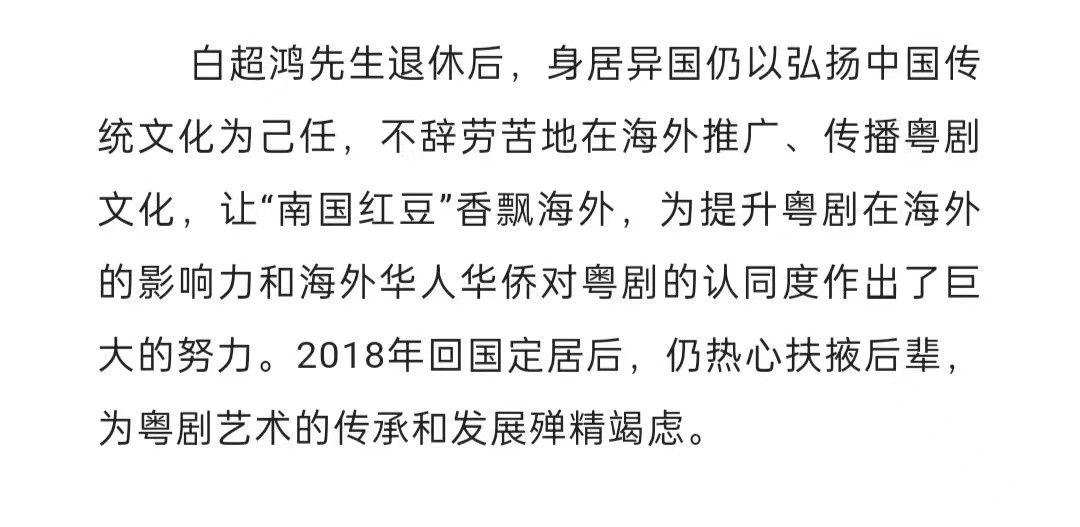 如今,白超鸿老人虽然离去了,但是他的后辈们会继续将我国的粤剧发扬光大,也算是不辜负老人的栽培和心血了。