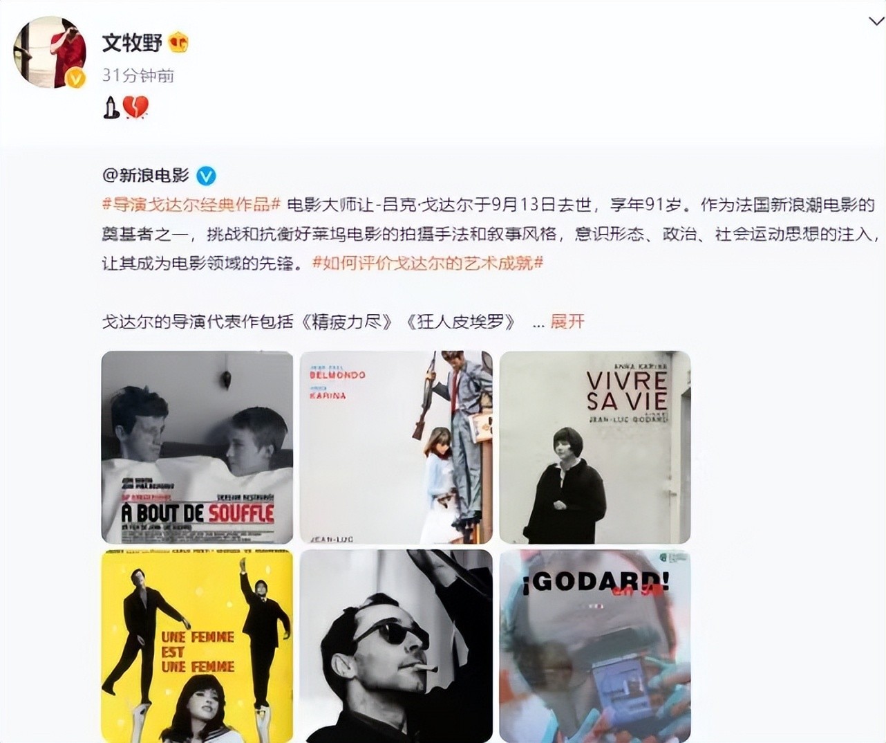 9月13日,法国著名导演戈达尔去世,享年91岁。
