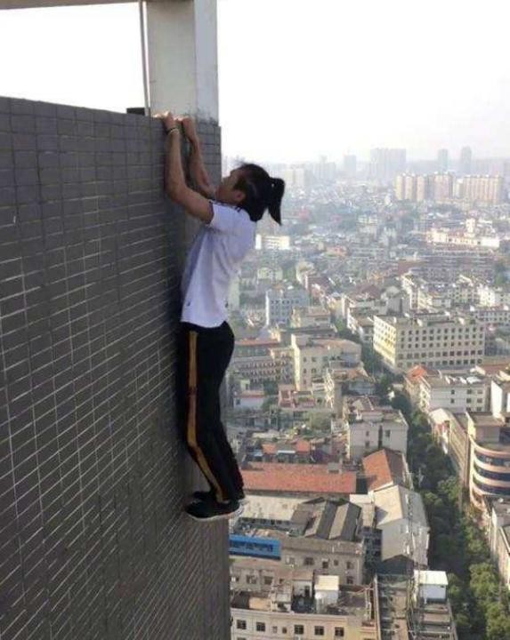 抵达263米高的大厦顶层后,吴永宁毫不犹豫地开始了他的高空表演。他双脚紧紧抓住顶部的钢板防护栏,整个身体则紧紧依靠在光滑的玻璃幕墙上,随后连续做出了几组惊心动魄的引体向上动作。