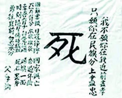 又如曾被誉为“模范父亲”的安县王者成,送其自动请缨出征的儿子王建堂时场景更催人泪下。王者成赠送给儿子的竟是一面“死”字旗!他在臼布旗正中写了个大大的“死”字,同时在左方写道:“国难当头,日寇狰狞。国家兴亡,匹夫有分。本欲服役,奈过年龄。幸吾有子,自觉请缨。赐旗一面,时刻随身。伤时拭血,死后裹身。勇往直前,勿忘本分!”(见《绵阳文史资料选刊》第1 辑)这既是一个父亲对儿子的嘱托,也是千千万万的四川百姓对所有出川抗日军人的嘱托,所体现的是一种民族大义。