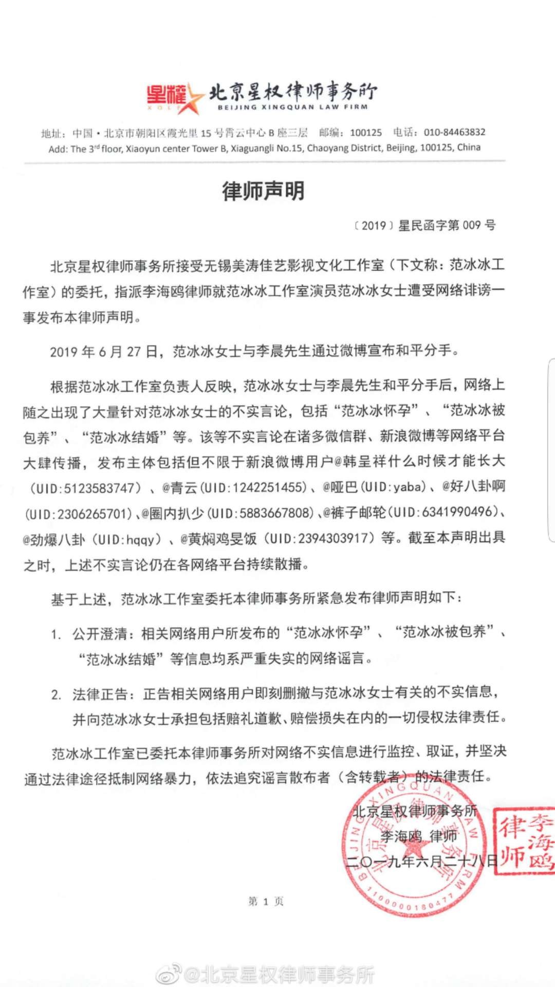 范冰冰工作室委托律师发出声明