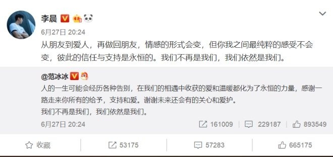 6月27日晚8点,范冰冰在微博公开宣布与李晨分手,结束四年感情,并引用当年官宣的恋爱体“我们”作结语:“我们不再是我们,我们依然是我们”。随后,李晨转发该条微博,表示双方已做回朋友。