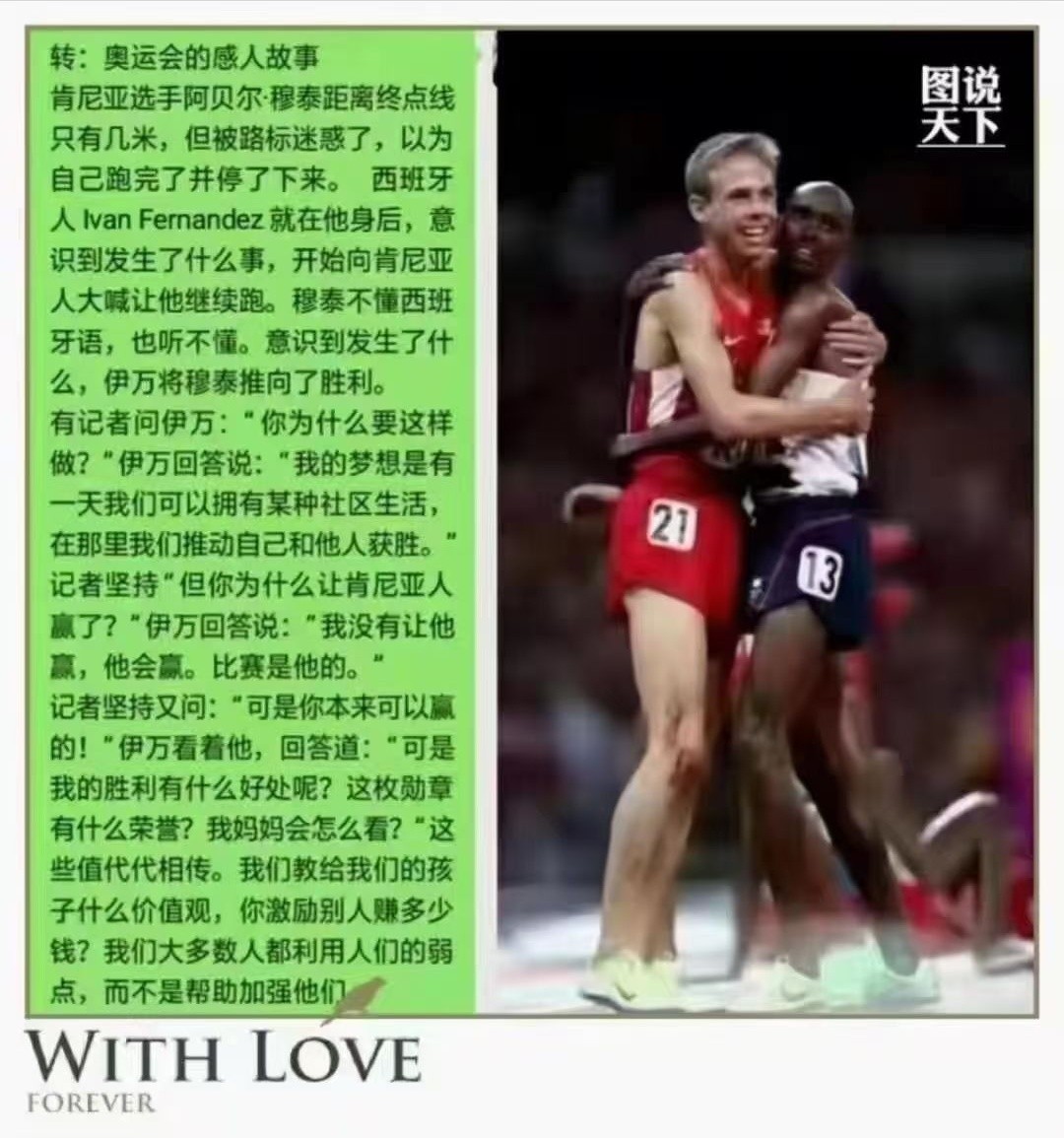 依我看,这才是真正的奥运精神表现!这是人类现代文明的硕果,现代文明人所应具备价值观的最好体现!