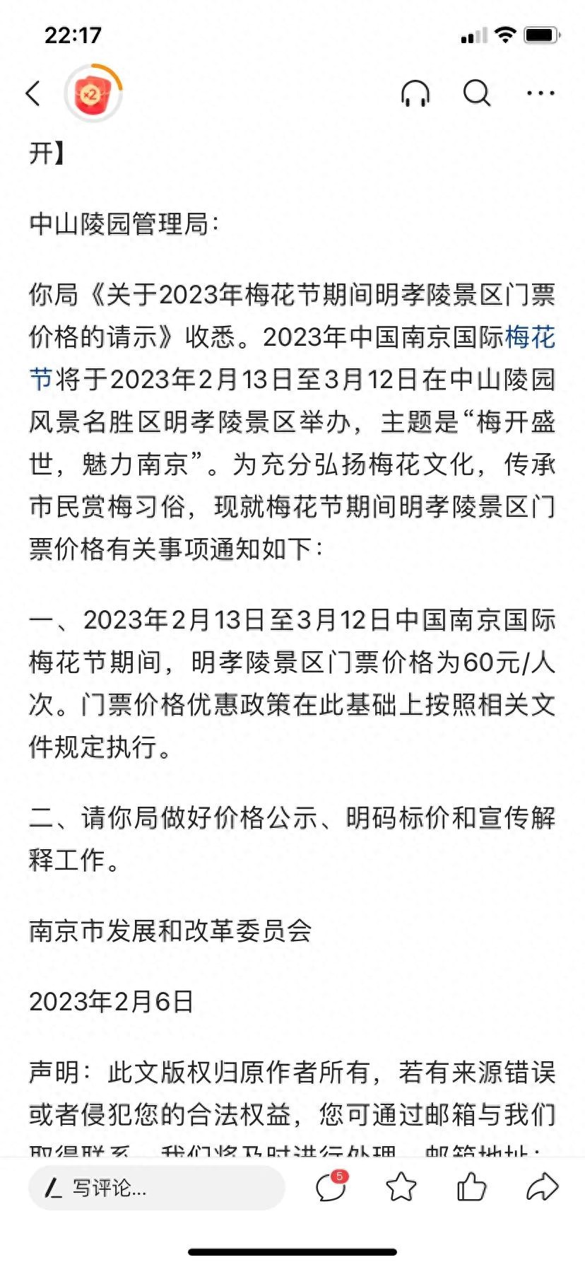 梅花节期间天气好的话应该很多人,这个降低门票做法挺不错的,反而前段时间看到南京红山动物园和栖霞山门票涨了,不知道听证会是由哪些代表参加的。