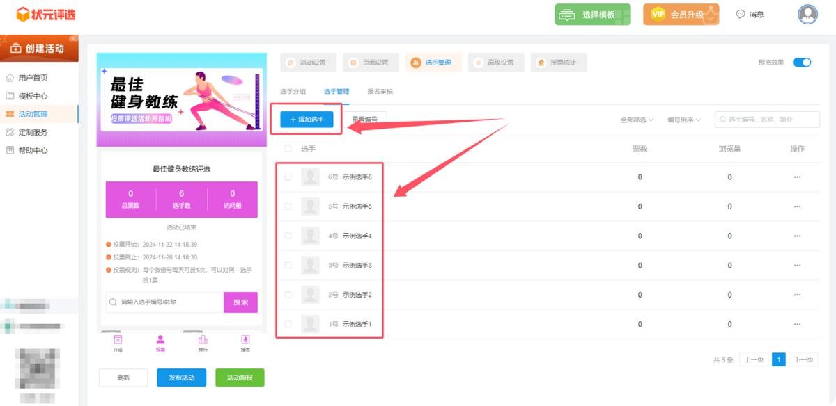 然后,在【选手管理】中,上传所有选手的个人资料,包括选手的名称、简介、照片等内容。