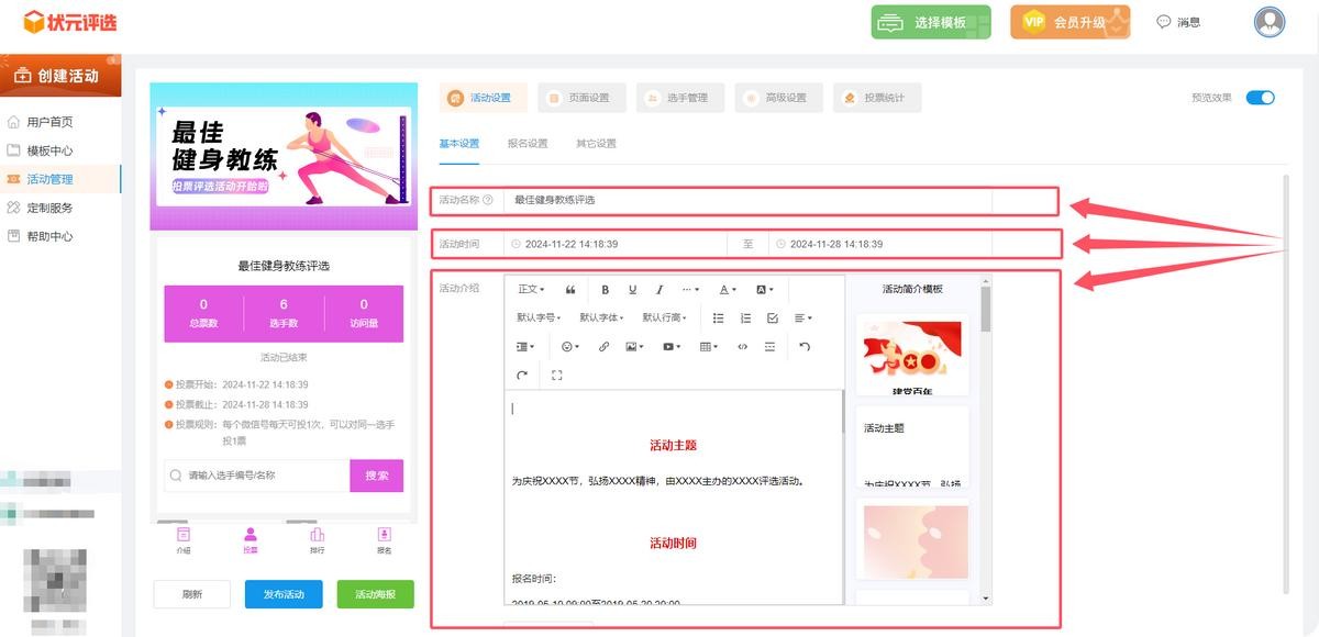 其次,在【活动设置】中,编辑活动基本信息,包括活动名称、简介、照片等。
