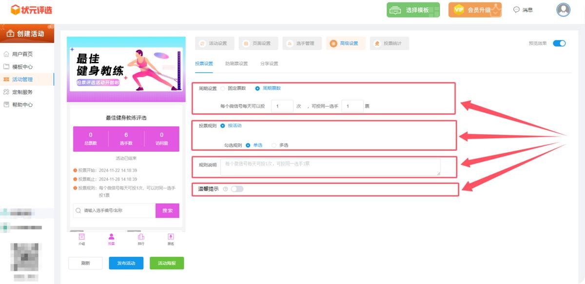 再然后,在【高级设置】中,完成投票规则的设置。即活动期间,可以给几名选手投票,又能够投几票等。