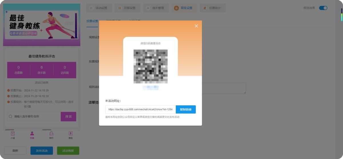 最后,上述步骤完成后,点击【发布活动】,系统会自动生成活动的链接和二维码。这样一场状元评选-免费微信投票制作平台-公众号投票制作系统-网络投票评选创建就制作完成了,是不是很简单?