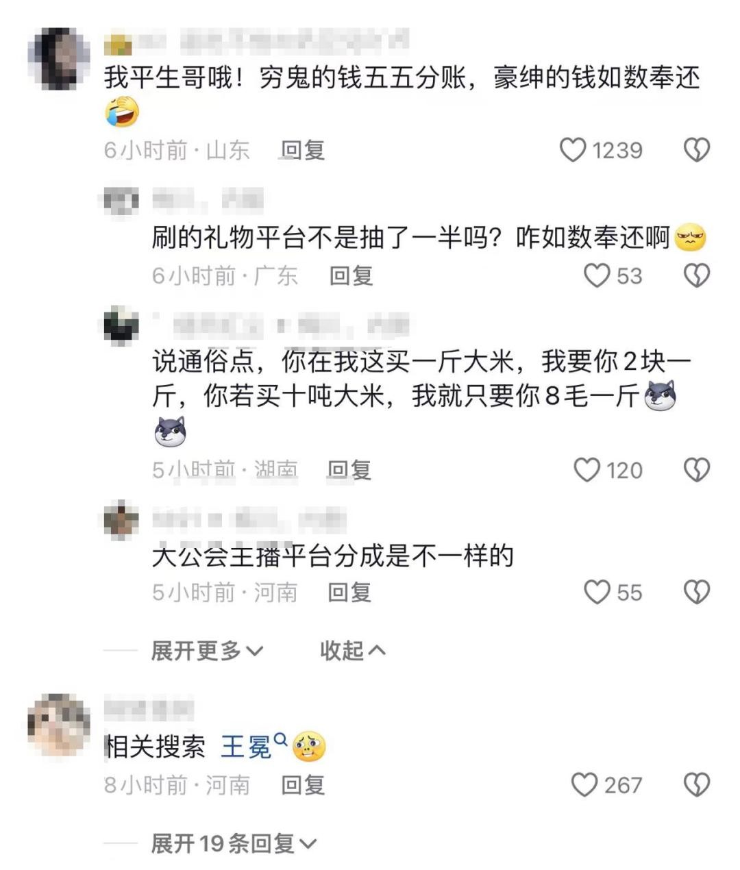 另外还有网友说道现在所有直播间的情况都是:穷鬼的钱五五分账,豪绅的钱如数奉还。