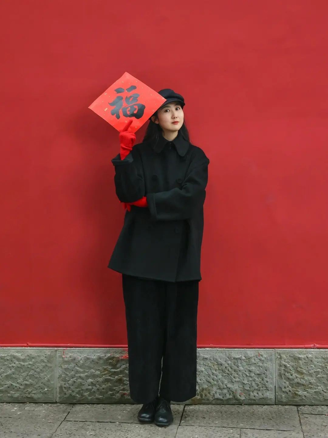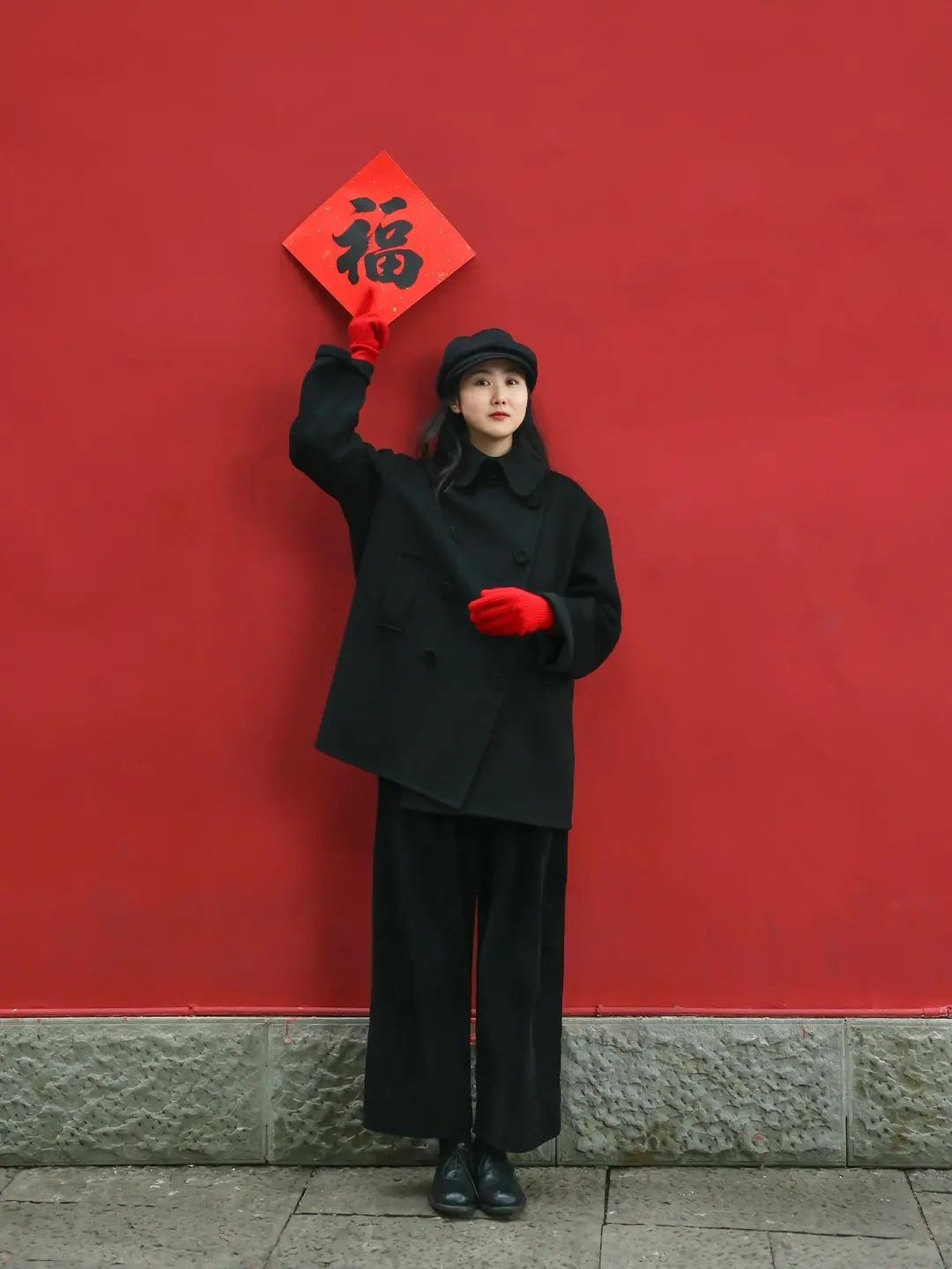 如果是找一面红墙拍照的话,不建议身上再大面积亮红色了,可以穿和红墙不一样的红色上衣,下装黑色、棕色或者白色;或者像我一样all black,再用红色手套点缀,对比会更强烈。
