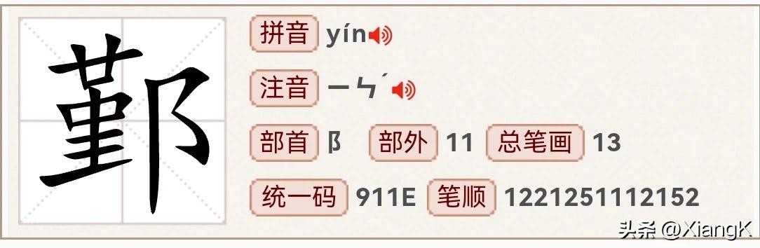 读音为“yín”,同音字“银”,部首为“阝”,总笔画13,左右结构。