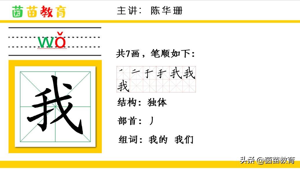 这是在陈老师的教学视频的讲解,“我”的部首是“丿”,独体结构。