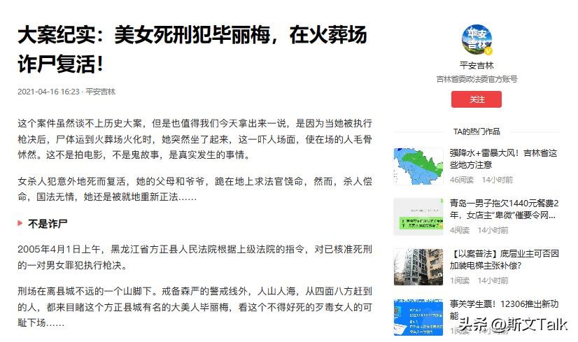 以上内容参考自平安吉林,2021.04.16,关于“大案纪实:美女死刑犯毕丽梅,在火葬场诈尸复活!”
