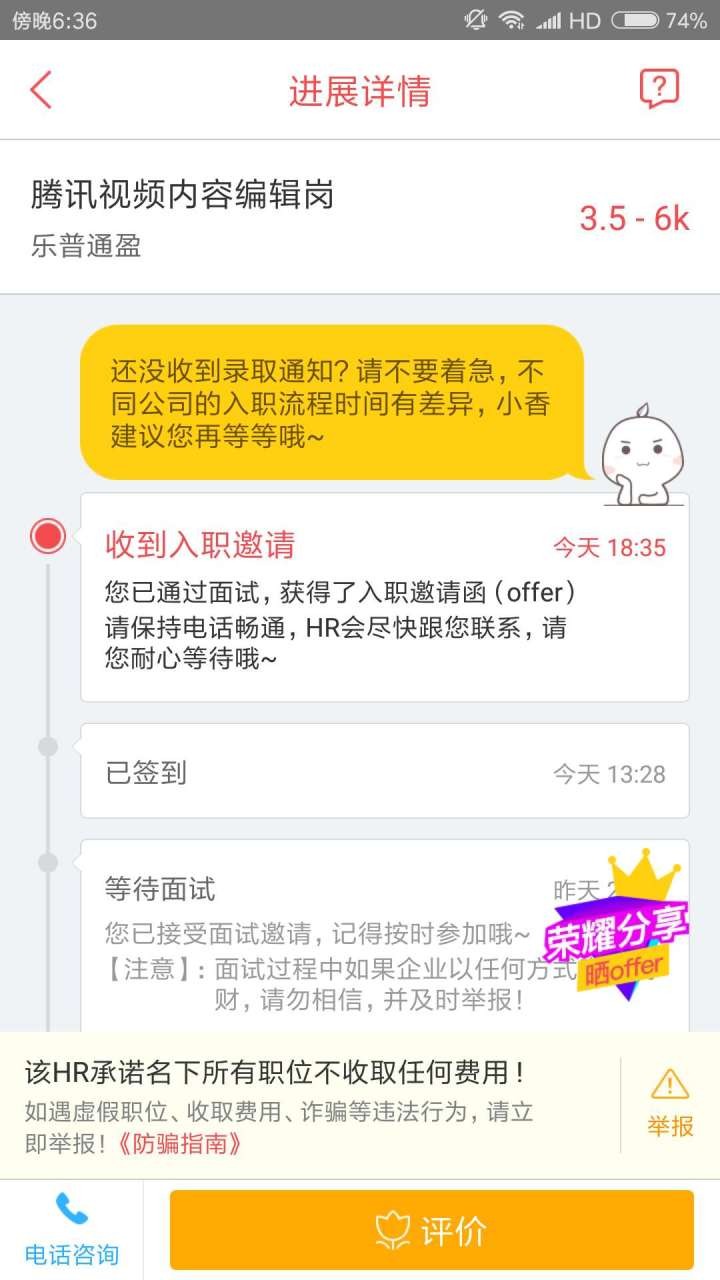以昨天面试的腾讯视频审核岗为例,下午三点进行的面试,下午7点左右,大家就在APP上收到面试结果了。