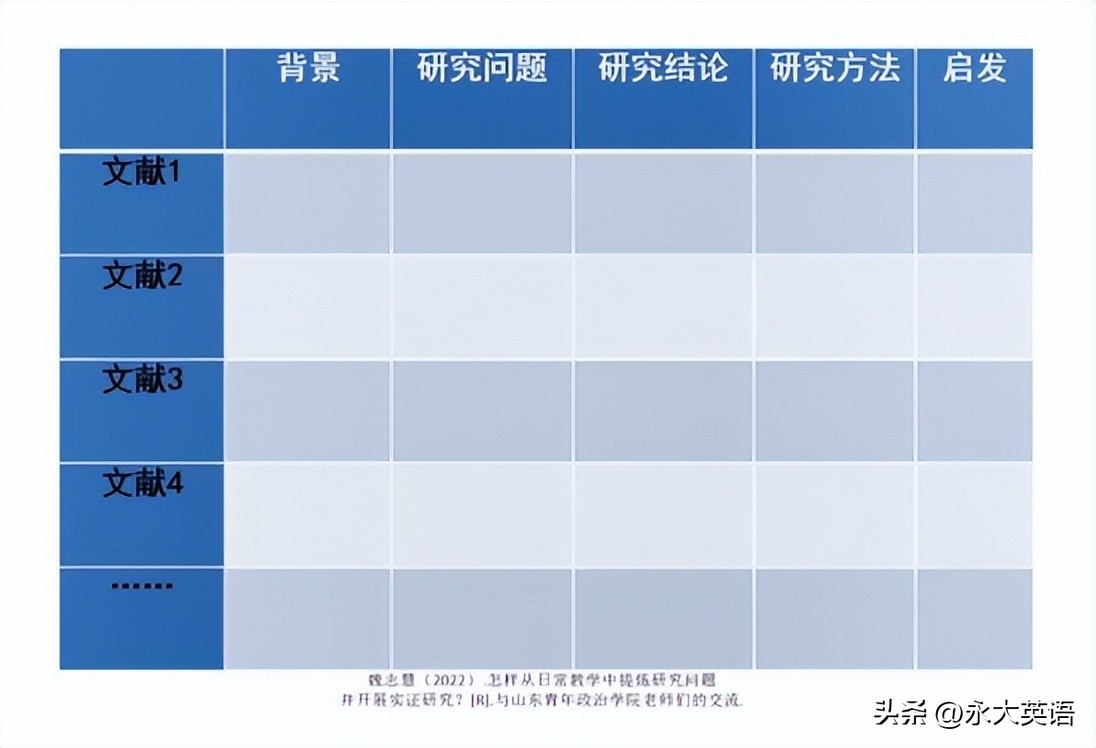 在这里,我列了一张表,引导大家关注核心问题。表格中的项目包括:这篇文章关注了哪些核心研究问题,得到了什么结论,用了什么方法,我们有什么启发。慢慢地,你会越积越多,就会得出自己关注什么研究问题,要采用什么方法。