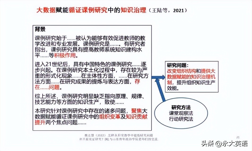 第二段,“进入21世纪后,具有中国特色的课题研究……逐步兴起”。这就到我们国家了。第二句马上就转折了,“在课例研究本土化过程中,存在较为严重的形式化现象”。这段话在讲,课例研究存在一些问题。第三段,“综上所述,课例研究明显缺乏指向原理、规律、技艺能力等方面的知识生产”。这里概述了第二段的问题。第四段,“尽管课例研究存在着诸多问题,本研究就聚焦在大数据赋能循证课例研究中的组织变革及知识贡献提升两个焦点问题”。这样,我们就知道了他的研究问题就是“通过改变组织结构和提供大数据赋能的知识治理机制,提升组织的知识生产效能”。尽管有了“课例研究”,但它还存在着很多问题,比如说,知识生产高度不够,原理性的、规律性的或者是技艺能力方面的知识生产水平低,要更好地提高知识生产效能。王教授用到了“课堂观察法”和“行动研究法”。