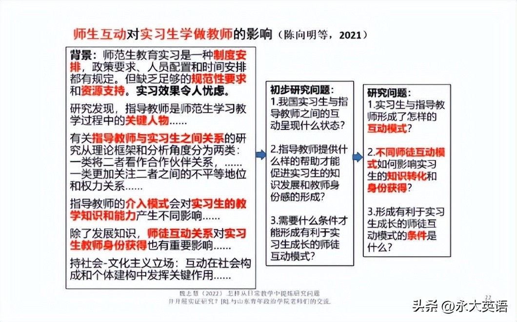 我们看PPT的右面,他先初步地呈现研究问题,研究问题最后就落在“我是不是可以研究这些问题”,也即,“实习生和指导教师形成了怎样的互动模式”。尤其是,国外已经有很多研究了,“到底形成了哪些类型的互动模式”。第二个是“不同的互动模式是怎么影响实习生的知识转化和身份获得的”。“知识转化”和“身份获得”都是术语,“知识转化”的意思是“怎么把理论知识转化成为实践知识”。还有“形成有利于实习生成长的师徒互动模式的条件是什么”,他提出三个问题。