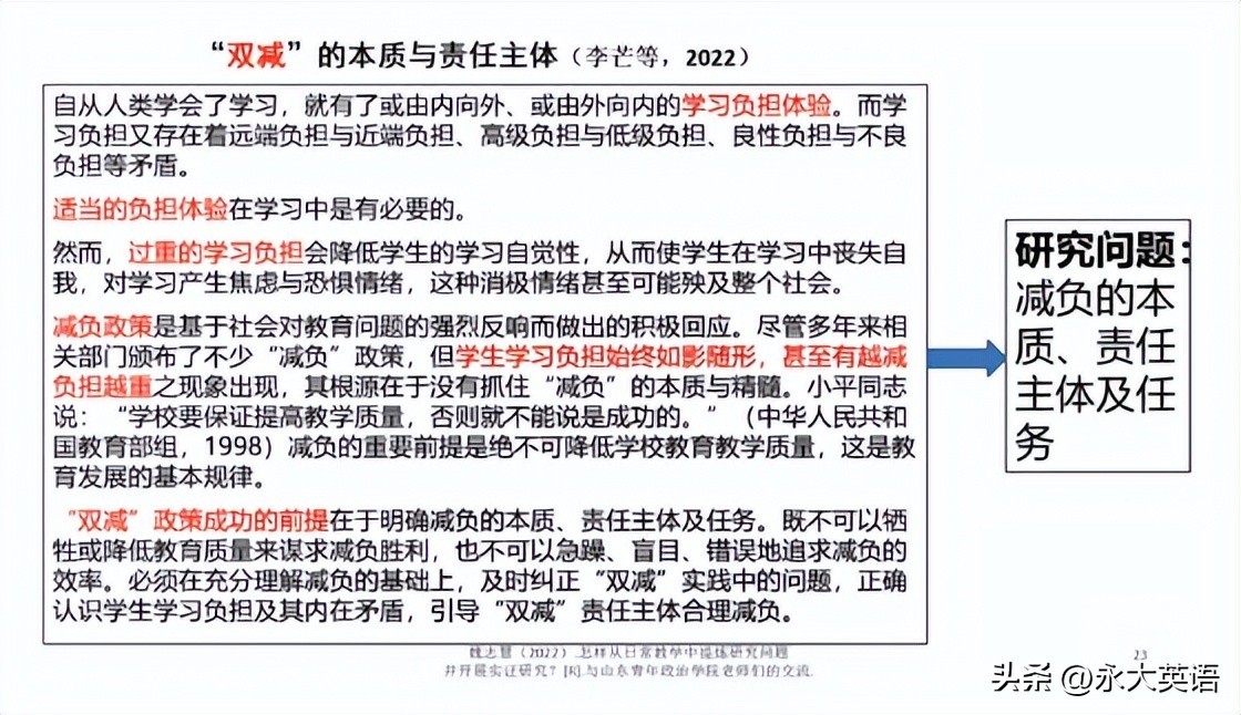 以上图为例,我再简单地举一个例子。这是我们《开放教育研究》今年发表的一篇文章,是有关“双减”的。我们知道,山东的中小学生学习压力也是蛮大的。其实,国家这几年“双减”,就是因为过重的学习负担会有负面作用,减负政策是政府基于社会对教育问题的强烈反响做出了积极回应。尽管我们颁布了不少减负政策,但是,学生的负担好像始终是“越减越重”。这个问题确实存在,上海也存在家长给孩子报很多课外辅导班的情况。现在一个家庭都有一两个孩子,家长希望给孩子更好的教育,但效果可能并不一定好。这篇文章帮助我们认清,“减负”的本质到底是什么,谁是责任主体,主要任务是什么。所以,它就围绕着这个话题进行论述。你看,他这篇论文也是一段一段地、不断地做分析,我觉得挺有意思。
