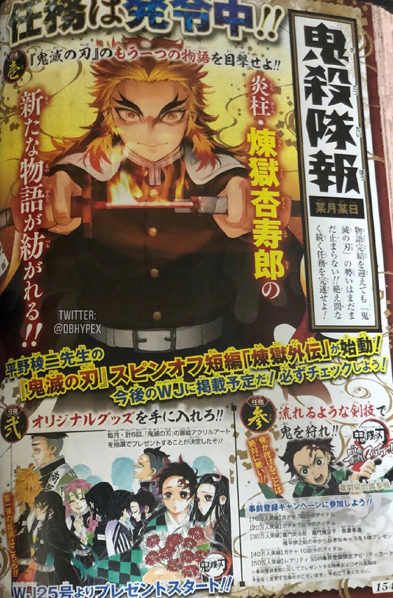 《鬼灭之刃》外传漫画已经宣布将在《少年JUMP》刊上连载,不过作者并不是吾峠呼世晴,而是由漫画家平野稜二担任创作。