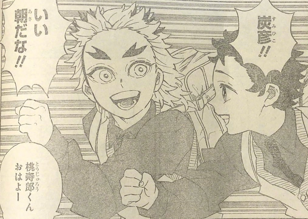 剩下比较有趣的信息就是伊之助的转世以及杏寿郎的转世桃寿郎成为了炭彦他们的同级生,看到杏寿郎之后原本已经柱们都转世成炭彦他们的同级生。