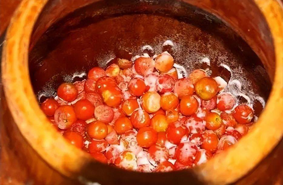 首先将肉多籽多的小西红柿洗净、擦干,再将洗净的西红柿裹一层白酒,略微捣烂后放入坛中,一层西红柿一层盐,密封后放于阴凉通风处,发酵一个月左右即可。再佐以辣椒、木姜子油等调味,生津开胃,满口鲜香。