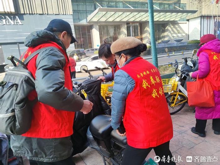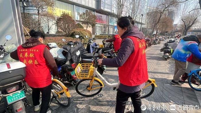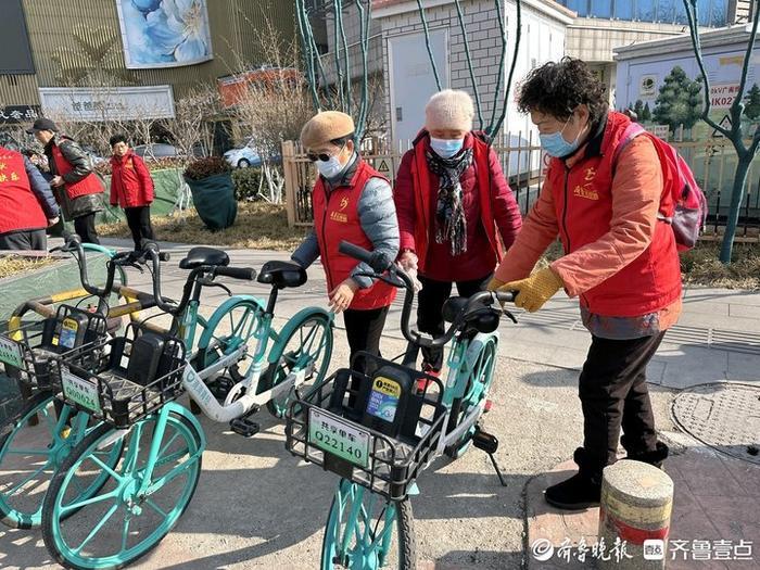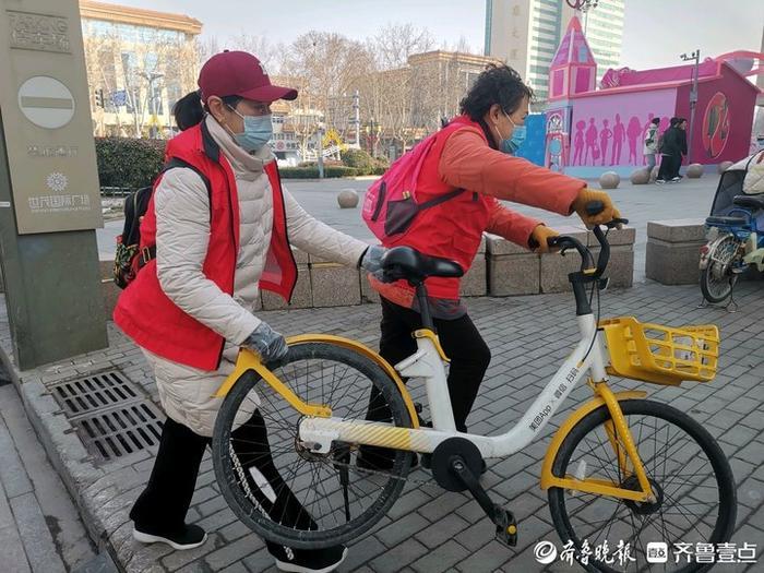 上午九点半,志愿者们在济南泉城广场东门处集合,虽然其中有不少60岁以上的老年志愿者,但大家十分积极,争先参与到整理非机动车的行列中。从泉城广场东门开始,40名志愿者分成两组开始工作,其中一组沿天地坛街往北进行整理,另一组沿黑虎泉西路两侧进行整理。