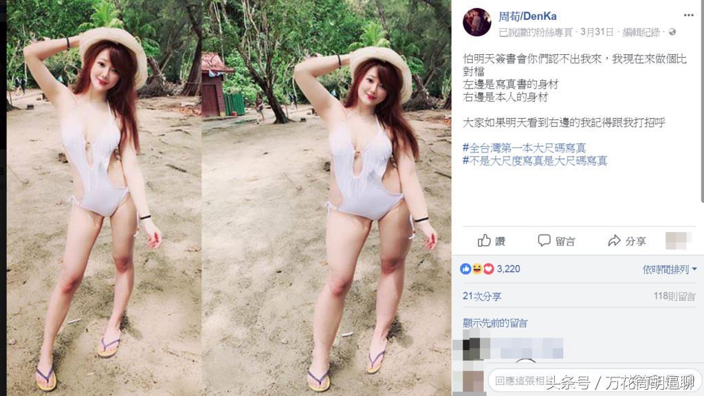 台湾网路辣模周荀(DenKa)外型甜美,同时拥有傲人F罩杯,经常在社群网站上分享生活趣事;日前她在脸书PO出穿着白色连身泳装辣照,爆乳加上S曲线相当吸睛,不过她又公开「本人真实身材」,整个人成了XXL加大尺码,修图对比照吓坏不少人。