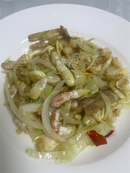 回到家把抽到的狗虾和海肠放水里吐吐沙,换几遍水,海肠剪掉头尾,扯出内脏,然后一起用葱姜蒜洋葱花椒面儿炒着吃,就不用再放盐了,是很新鲜的蛋白的味道,美味极了,当然啦,是大海新鲜的味道。